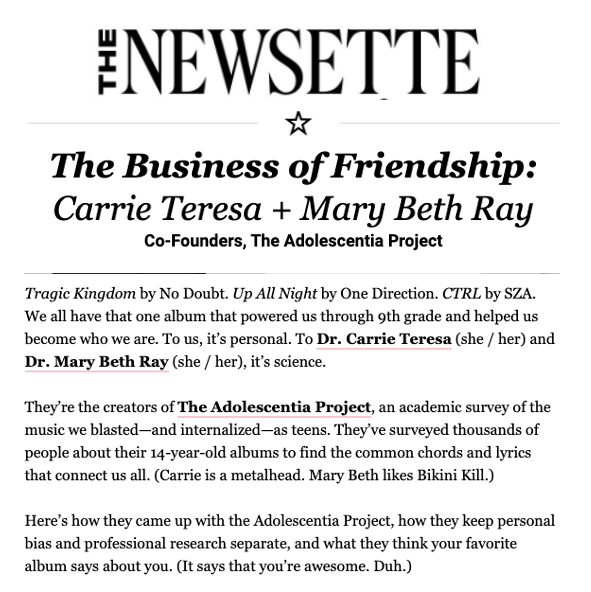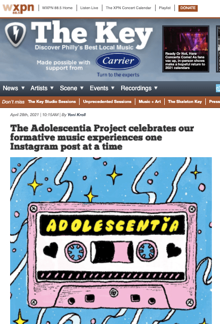 Press https://thenewsette.com/ https://open.spotify.com/episode/6n6eWJAYxaWr6ByoBMZPoB?si=OlTlcLErQ3WWV4mHbyzczg&dl_branch=1&nd=1 https://www.fox29.com/video/930974 https://klein.temple.edu/news/2021/05/love-letters-our-14-year-old-selves-phd-alumnae-start-digital-media-archive https://www.phillyvoice.com/the-adolescentia-project-instagram-music-memories/ https://thekey.xpn.org/2021/04/28/the-adolescentia-project/ https://cinepunx.com/cinepunx-episode-131-trainspotting-96-clue-85-w-mary-beth-and-carrie-of-the-adolescentia-project/ Share this: Share on X (Opens in new window) X Share on Facebook (Opens in new window) Facebook Like Loading...